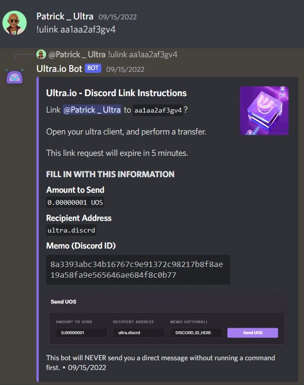 Le bot Discord agit comme l'une de nos preuves de concept qui relie l'identité d'un utilisateur dans une application à son identité permanente sur le réseau d'Ultra. Dans ce contexte, la liaison signifie simplement que dans Discord, vous avez identifié et confirmé le fait que vous contrôlez votre compte blockchain Ultra Mainnet. Il s'agit d'une action non permanente qu'il vous est possible de dissocier dans un second temps si vous le souhaitez. Ce qu'il est important de souligner ici, c'est que ce que nous montrons n'est qu'un aperçu de la puissance de l'Ultraverse.
